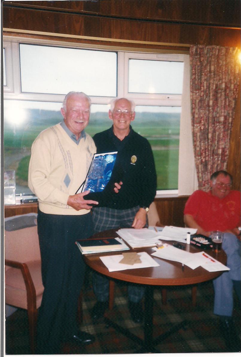 Gordon Smith becomes an Honorary Member of Buchan Seniors(Decanter presented to him by Davie Wood, Captain)