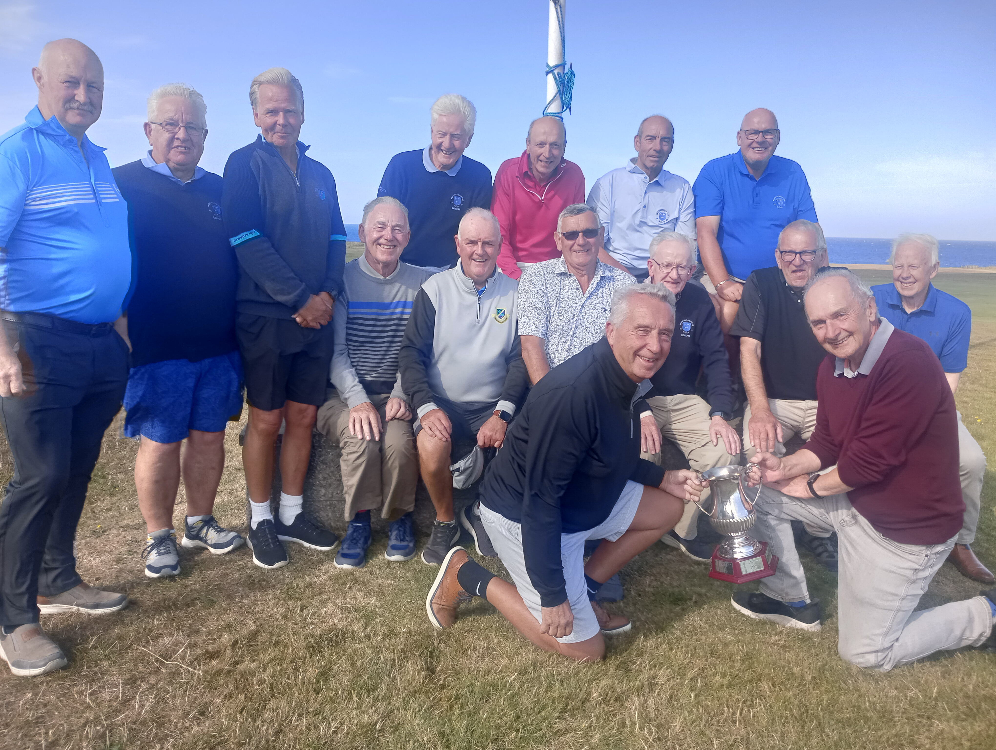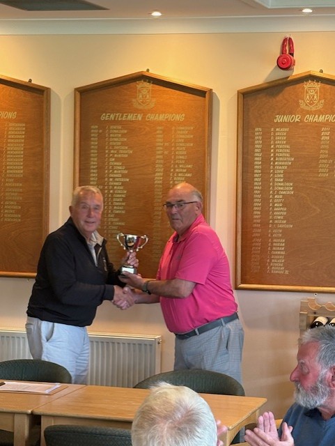 Buchan Seniors Captain presenting Divot Cup to Banffshire Captain . Banffshire Seniors won 6 games to 3 at Inverurie
