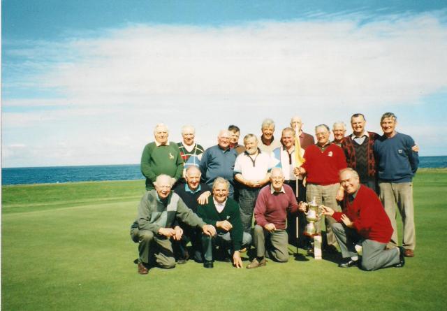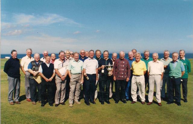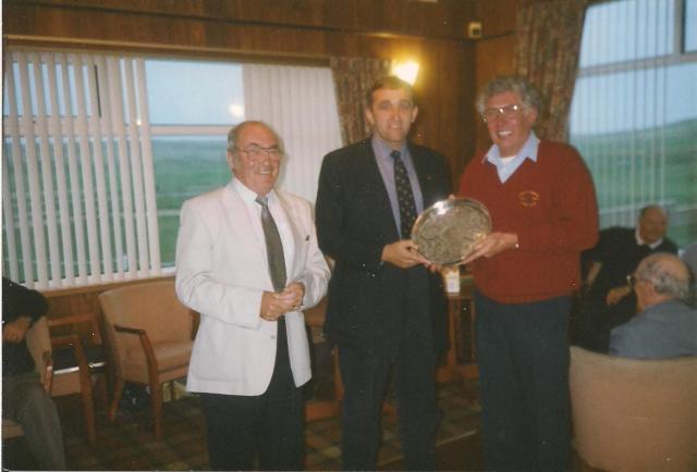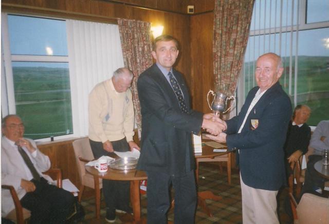 Bruce Milton, of sponsors Masson and Glennie, presents team trophy to Captain of team Cruden Bay. 24/9/98